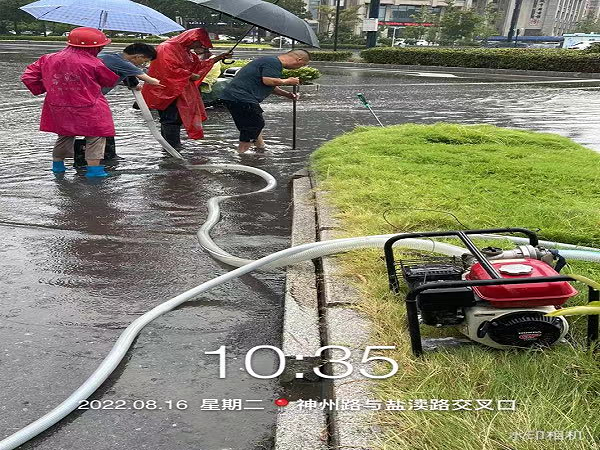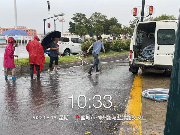 上午10點(diǎn),經(jīng)路面作業(yè)現(xiàn)場(chǎng)工作人員報(bào)告,在神州路與鹽瀆路交界處,最深積水達(dá)到15CM以上。應(yīng)急小分隊(duì)接到指令后,迅速駕駛車輛,運(yùn)載水泵、水管、鐵鍬等防汛物資,不到10分鐘就迅速趕到現(xiàn)場(chǎng)。在公司負(fù)責(zé)人劉鳳權(quán)、孫榮才等人的現(xiàn)場(chǎng)指揮下,搶險(xiǎn)人員立即查找造成堵塞積水的原因。經(jīng)過查找發(fā)現(xiàn),原來積水處只有一個(gè)下水道,無(wú)法快速排水。劉鳳權(quán)當(dāng)機(jī)立斷,指揮搶險(xiǎn)人員立即撬開附近窨井蓋,把水管放進(jìn)窨井,發(fā)動(dòng)水泵,往不遠(yuǎn)處的雨水井排水。這時(shí)雨越下越大,風(fēng)越刮越猛,搶險(xiǎn)隊(duì)員們冒著狂風(fēng)暴雨,不畏雷鳴電閃,齊心協(xié)力清理積水,有的發(fā)動(dòng)水泵梳理管道;有的用大掃帚清掃路面積水;有的清理積水中的垃圾雜物……隊(duì)員各司其職,分工合作,在時(shí)間緊迫、環(huán)境惡劣的情況下盡力完成排水作業(yè),經(jīng)過緊急搶排,道路恢復(fù)了通暢。