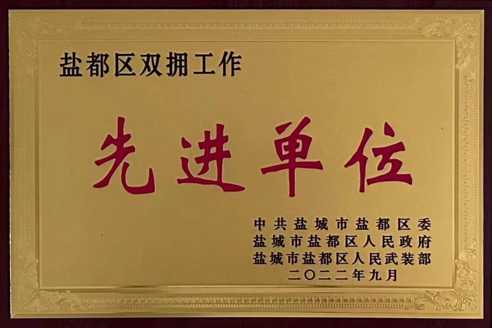 近日,經(jīng)區(qū)委、區(qū)政府、人民武裝部批準,集團榮獲2022年度鹽都區(qū)雙擁工作先進單位。